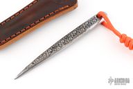 Hand forged by Ryan Johnson at the Gold Point Forge! The Thistle from Ryan is a handy small and discreet EDC companion, that is light enough to carry all day while still being substanial and easy to use. The shaft features RMJ's pirate motif that adds a killer look while also providing a bit of extra traction. The triangular needle like point is perfect for when you need to mark, pry or poke a hole in somthin'! Added cordage on the back to aid in ease of deployment. Comes with a custom leather sheath with IWB clip and finished with Ryan's homemade dye concoction.