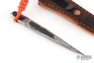 Hand forged by Ryan Johnson at the Gold Point Forge! The Thistle from Ryan is a handy small and discreet EDC companion, that is light enough to carry all day while still being substanial and easy to use. The shaft features RMJ's pirate motif that adds a killer look while also providing a bit of extra traction. The triangular needle like point is perfect for when you need to mark, pry or poke a hole in somthin'! Added cordage on the back to aid in ease of deployment. Comes with a custom leather sheath with IWB clip and finished with Ryan's homemade dye concoction.