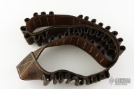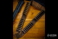 Don't find yourself at high noon with an empty chamber! These bandoliers are meticulously built using hides hand selected for their character and texture. Premium cowhide construction make us the main band, closing at the bottom with a 'V' to make the bandolier naturally fit around you. Dark brown base, with black shell loops. Each bandolier has five groups of eight shell loops, making for a total of forty 12 Gauge at the ready!