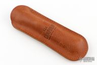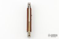 This 11" Swivel Bolster Auto by Frank Beltrame features a tumbled bayonet ground blade with false top edge. The handle has stainless steel bolsters, front and rear, snakewood scales, brass liners, stainless spring. Comes with a leather sheath. Excellent condition.