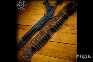 Don't find yourself at high noon with an empty chamber! These bandoliers are meticulously built using hides hand selected for their character and texture. Premium cowhide construction make us the main band, closing at the bottom with a 'V' to make the bandolier naturally fit around you. Dark brown base, with black shell loops. Each bandolier has five groups of eight shell loops, making for a total of forty 12 Gauge at the ready!