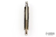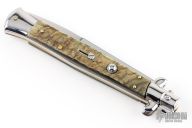 This 11" Swivel Bolster by Frank Beltrame features a mirror finished bayonet ground blade with false top edge. The handle has mirror polished stainless steel bolsters, front and rear, sheep horn scales, mirror polished brass liners and stainless steel spring. Excellent condition. Comes with a brown leather slip sheath.