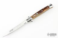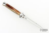 This Swivel Bolster Auto has a bayonet ground blade with false top edge. The handle is composed of nickel silver front and rear bolsters, brass liners all complemented by honey horn scales. Comes with a leather sheath. Excellent condition.