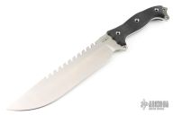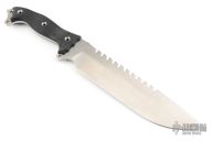 This Fusion Battle Saw by Busse Knives has a satin finished blade with 10 saw teeth on the spine, large finger choil, .209" blade stock, 2.081" depth, full tang construction. The handle has black G-10 scales, exposed butt tang with lashing points. New from maker.