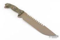 This Fusion Battle Saw by Busse Knives has a sage coated blade with 10 saw teeth on the spine, large finger choil, .215" blade stock, 2.081" depth, full tang construction. The handle has black/green G-10 scales, exposed butt tang with lashing points. New from maker.