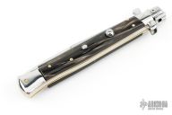 This Swivel Bolster Auto has a bayonet ground blade with false top edge. The handle is composed of stainless front and rear bolsters, brass liners all complemented by buffalo horn scales. Comes with a leather sheath. Excellent condition.