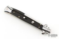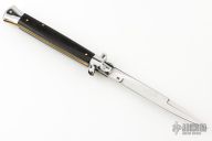 This Swivel Bolster Auto has a bayonet ground blade with false top edge. The handle is composed of stainless front and rear bolsters, brass liners all complemented by wood scales. Comes with a leather sheath. Excellent condition.
