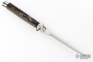 This 13" Swivel Bolster features a polished ground blade with false top edge. The handle has stainless steel bolsters, front and rear, horn scales, brass liners, stainless spring. Comes with a leather sheath. Excellent condition.