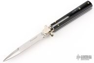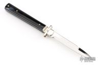 This Leverlock Auto by AGA Campolin has a polished stainless steel spear point blade with false top edge. Handle has buffalo horn scales with black liners, nickel silver bolsters, stainless steel liners and backspacer. Comes in a leather sheath. Excellent condition.