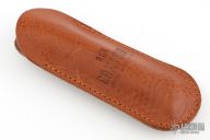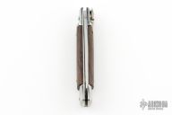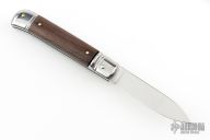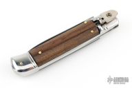 This Lever Lock Auto has a mirror polished stainless steel spear point blade. Handle has wood scales, steel front and rear bolsters, stainless steel liners and a nickel silver lock release button. Comes in a leather sheath. Has some light scuffs and patina, otherwise excellent condition.