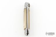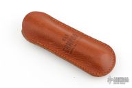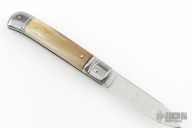 This Lever Lock Auto has a mirror polished stainless steel spear point blade. Handle has horn scales, steel front and rear bolsters, stainless steel liners and a nickel silver lock release button. Comes in a leather sheath. Has some light scuffs and patina, otherwise excellent condition.