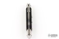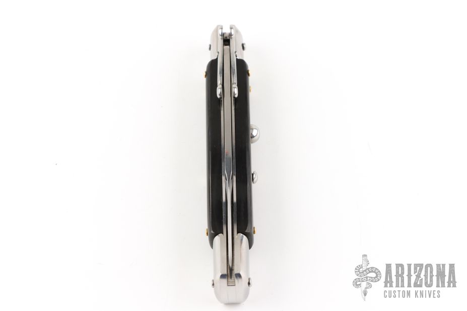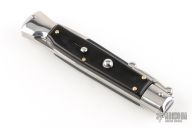 This Swing Guard Lockback Auto by AKC Italy has a polished stainless steel spear point blade with false top edge. The handle has wood scales with stainless steel bolsters, liners, and stainless steel back spacer and lock.  Includes original box and a leather sheath. Excellent Condition.