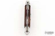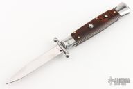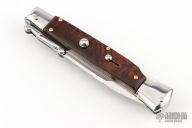 This Swing Guard Lockback Auto by AKC Italy has a polished stainless steel spear point blade with false top edge. The handle has wood scales with stainless steel bolsters, liners, and stainless steel back spacer and lock.  Includes original box and a leather sheath. Excellent Condition.