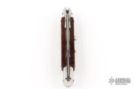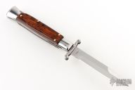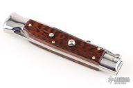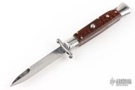 This Swing Guard Lockback Auto by AKC Italy has a polished stainless steel spear point blade with false top edge. The handle has wood scales with stainless steel bolsters, liners, and stainless steel back spacer and lock.  Includes original box and a leather sheath. Excellent Condition.