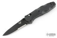 This 580 Barrage from Benchmade features a black partially serrated drop point blade with swedge and dual thumbstuds. The handle is comprised black FRN scales over stainless steel liners and FRN backspacer. This knife also features the AXIS lock mechanism and sliding safety on spine. Includes original box and papers. Has a couple light scuffs, otherwise excellent condition. First Production Run #98 of 1000.