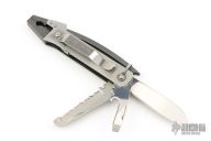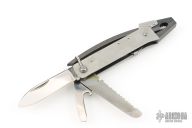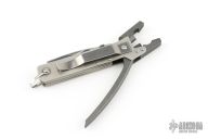 This Original ToolClip by SOG features a pair of pliers with wire cutter. The handle is stainless steel and holds four blades. Main blade, serrated blade with a file with flat head screwdriver on the end, bottle/can opener, small flat head screwdriver. Has a bail that swivels down to hold the plier handle in place. Has a tip up clip. Has some light scuffs and scratches, otherwise excellent condition.