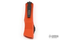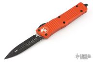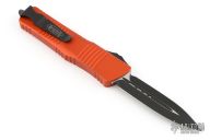 This Combat Troodon by Microtech Knives features a black double edged blade. The handle has an orange aluminum frame with tip down black stainless steel clip and hardware. Comes with original box and papers. S/N 22053 and dated 03/2019. Excellent condition.