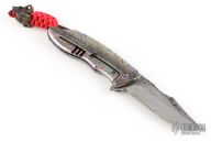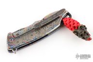 This S7 flipper by Michael Zieba features a Damasteel blade with a notched thumbrest and a flipper. The handle has a marble carbon fiber and laser engraved titanium frame, brass backspacer and an anodized titanium tip up clip with hidden screws. Nice detent, lockup and blade seating. Rides on bearings. Comes in the maker's zipper case. Excellent condition.