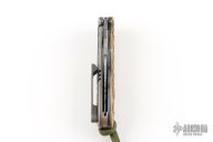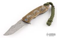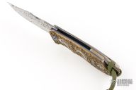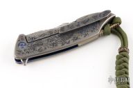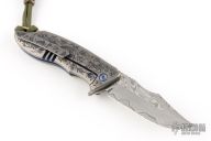 This S7 flipper by Michael Zieba features a Damasteel blade with a notched thumbrest and a flipper. The handle has a laser engraved brass scale, silver inlays, anodized titanium frame, brass backspacer and titanium tip up clip with hidden screws. Nice detent, lockup and blade seating. Rides on bearings. Comes in a pouch. Excellent condition.