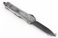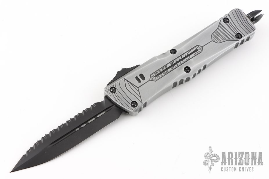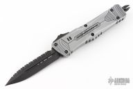 This Combat Troodon OTF automatic features a D/E blade with one fully serrated edge. The handle is composed of an aluminum frame. Stainless steel clip. Glass breaker. Excellent condition. Comes with original box.