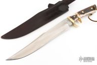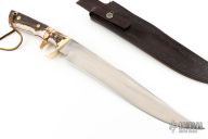 This Sub-Hilt Boar Hunter from Ricardo Perpina features a satin finished blade with a false top edge and a full tang construction, .238" blade stock and 1.919" blade depth.  The handle has a brass guard and sub-hilt with stag scales and red liners, brass and mosaic pins. Comes with a hand tooled leather sheath. New from maker. He designed this model over 40 years ago specifically for hunting wild boar.