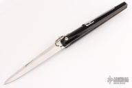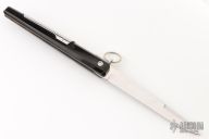 This Ring Folder by Jaques Mongin features a mirror polished blade with false top edge. The handle is a single piece of buffalo horn with a mirror polished stainless steel ring pull lock. Has a chip in the horn near the pivot, otherwise excellent condition.