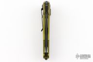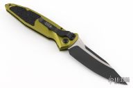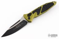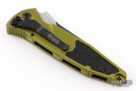 This Socom Elite Auto from Microtech has a two-toned drop point blade with notched thumbrest. The handle has a green aluminum frame with non-slip rubber inserts and a tip down stainless steel clip, black hardware. Dated 03/2024 and S/N 12005. Includes original box. Has a couple light scuffs, excellent condition otherwise.