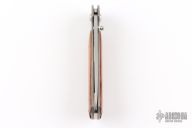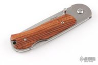 This Lockback folder by Howard Hitchmough features a hand rub satin finished blade with a single thumbstud. The handle has a bead blasted titanium frame, wood overlays, stainless steel backspacer. Smooth action. Nice blade seating and lockup. Excellent condition.
