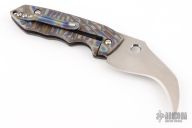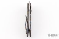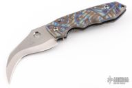 This knife by Steve Ryan features a satin finished chisel ground blade with thumbhole and notched thumbrest. The handle has a flamed and milled titanium frame and matching tip up clip. Nice detent, lockup and blade seating. Has a few light scuffs, otherwise excellent condition. Comes with a zippered case.