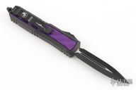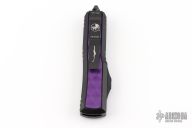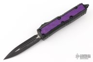 This Daytona by Microtech Knives features a two-tone finished blade with black bevels and satin flats.  The handle has purple bubble inlays, a black aluminum frame and a black steel tip down pocket clip. S/N 1624 Dated 03/2024. Comes with original box. Excellent condition.