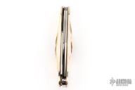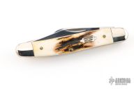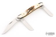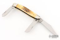 Three blade slipjoint by Bradford Cutlery has mirror polished blades with nail nicks. The handle has nickel silver bolsters, stag covers, brass liners and steel springs. Has a few light scratches, otherwise excellent condition.