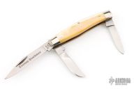 This Sunday Stockman from Bull Dog Brand Knives features polished blades with nail nicks. The handle is comprised of nickel silver bolsters, gold lip pearl covers over brass liners and stainless steel backsprings. Excellent condition. Dated 1996