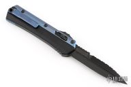 This Glykon by Microtech features DLC double edge blade with serrated top edge, fullers, and notched thumbrest. The handle has a black aluminum chassis with blue anodized titanium overlays and tip down clip. Comes with original box. Excellent condition. Dated 03/2024.
