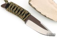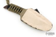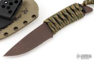 This Globetrotter fixed blade by Jesse Jarosz features a two tone chisel ground blade with false top edge, .150" blade stock and 1.291" blade depth, full tang construction. The handle has paracord wrap over flat cord wrap. Comes with a Kydex sheath. Has some light scuffs/scratches, otherwise good condition.