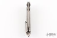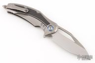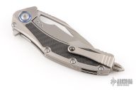 This Matrix flipper by Microtech features a hand rub satin finished blade with a notched thumbrest and flipper. The handle has a titanium frame, carbon fiber inlays, and anodized titanium pivot collars. Comes with original box. Nice detent, lockup and blade seating. Excellent condition.