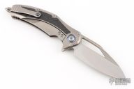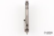 This Matrix flipper by Microtech features a hand rub satin finished blade with a notched thumbrest and flipper. The handle has a titanium frame, carbon fiber inlays, and anodized titanium pivot collars. Comes with original box. Nice detent, lockup and blade seating. Excellent condition.