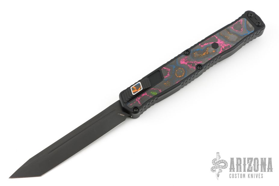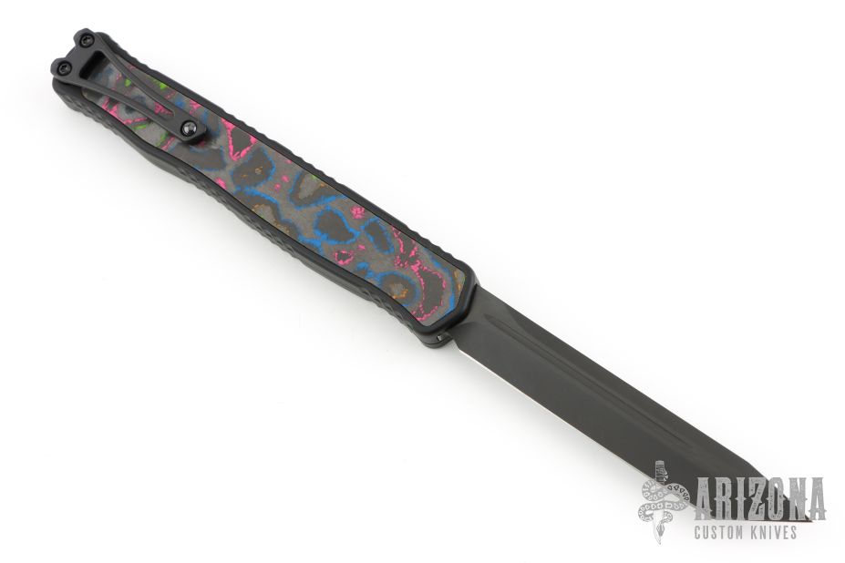 This Cleric II OTF by Heretic Knives features a DLC stonewashed tanto Magnacut blade with false top edge and fullers. The handle has a black aluminum frame with Awesome 80's Camo Carbon inlays, DLC stainless steel tip down clip with ceramic ball. Comes with box, lube and papers. Excellent condition.