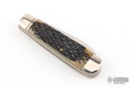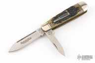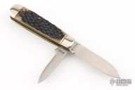 This slipjoint by Remington Knives features a satin finished blades with nail nicks. The handle has nickel silver bolsters, jigged bone covers with a nickel silver bullet escutcheon, brass liners and stainless steel spring. Has half-stop, flush in all positions. Comes with original box and papers. Excellent condition. Dated 2004