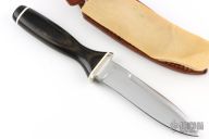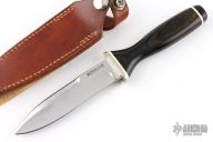 This Dagger by Morseth Knives features a satin finished blade with a false top edge and a hidden tang construction, .173" blade stock, .944" blade depth.  The handle features a nickel silver guard and a dymondwood grip, white spacers and black paper micarta butt.  Includes a brown leather sheath with velcro backing. Has a few light scratches, otherwise excellent condition.