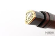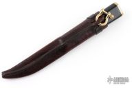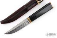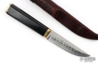 This Tapio Wirkkala Design Pukko by Hackman Finland features a jeweled blade with .131" blade stock and .781" blade depth, hidden tang construction. The handle has brass bolster and butt cap and a black paper micarta handle. Comes with a brown leather sheath. Excellent condition.