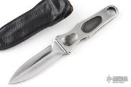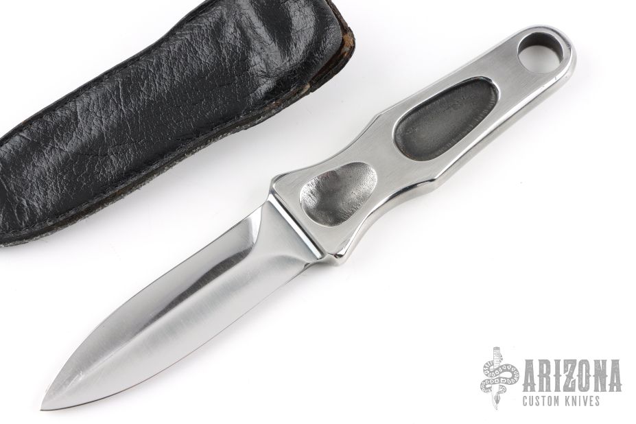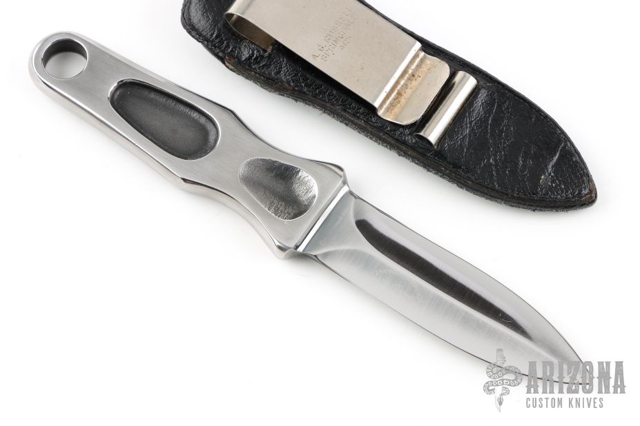 This Sting is an original A.G. Russell Sting from 1977, featuring an integral mirror polished double-edged blade and satin handle. .115" blade stock and .864" blade depth with full integral construction. Comes with black leather sheath. Great look and feel. Has a few light scratches, otherwise excellent condition.