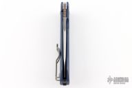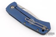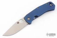This Slysz Bowie by Spyderco features a satin finished blade with notched thumbrest and thumbhole. The handle has a blue anodized titanium frame with notched G-10 backspacer and tip up, left or right reversible clip. Nice detent, lockup and blade seating. Includes the original box, zippered case and papers. New condition.