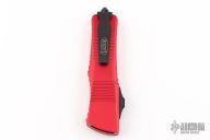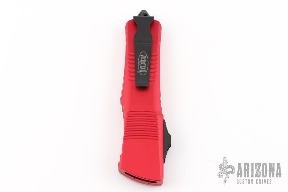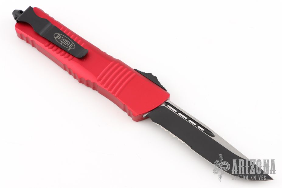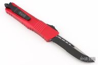 This Combat Troodon OTF automatic features a black S/E blade with a partially serrated edge. Red aluminum handle, black stainless steel clip, tip down carry and hardware. Glass breaker. Serial number 43903 and dated 08/2023. Comes with original box. Excellent Condition.