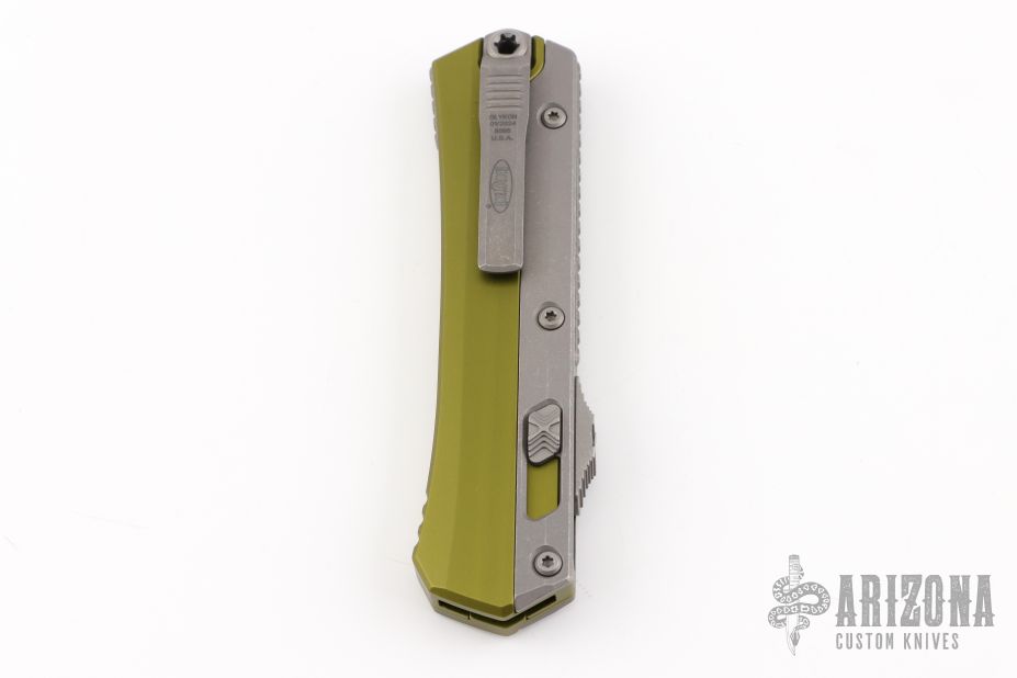 This Glykon by Microtech features a apocalyptic double edged blade with fullers and notched thumbrest. The handle has an OD Green anodized aluminum chassis with bead blasted titanium overlays and tip down clip. Comes with original box. Dated 01/2024 and #5095. Excellent condition.