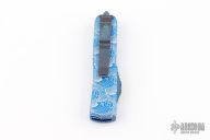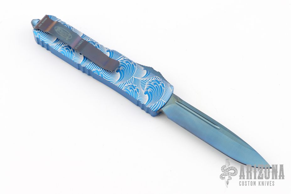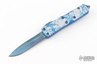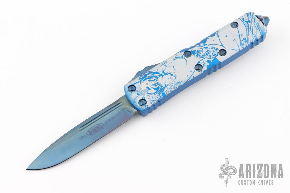 This UTX-85 by Microtech features a blue satin finished blade with fullers. The handle has a blue aluminum frame with blue hardware and tip down clip. Comes with original box. Dated 01/2023 and S/N 92459.  Includes the original box. Excellent Condition.