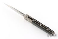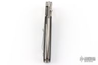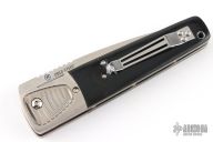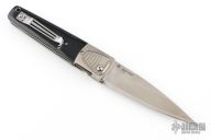 This Caledonian Edge from Cold Steel has a satin finished San Mai III stainless steel spear point blade with single thumb stud and notched thumb rest. Handle is black linen micarta over titanium liners, titanium bolsters, and lanyard hole. Excellent condition. Comes with original box and metal case.