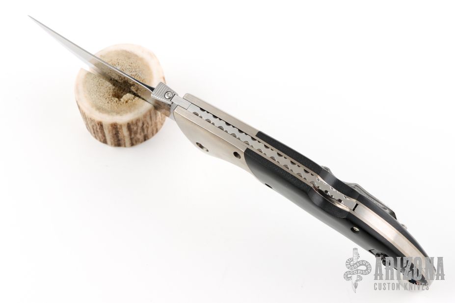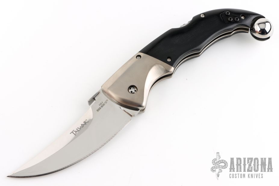 Designed by Lynn C. Thompson, the Talwar™ blends the sleek style of the east with the dynamic technology of the west. Using a Titanium frame as a foundation, the pistol grip handle features highly polished black linen micarta slabs with deeply carved finger grooves that allow it to settle naturally in one’s hand for maximum control. And its curved shape allows for reverse, or palm reinforced gripping techniques. Additionally, a hard-hitting ball shaped pommel enhances the Talwar’s™ versatility. Made from mirror polished stainless steel, it can be used as a striking tool to deliver blows to bony areas, nerve centers, and other soft targets. It can also serve as a secondary grasping point, allowing its user to extend his reach by as much as three inches.