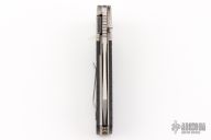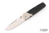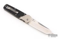 This Hatamoto linerlock by Cold Steel has a high satin finished San Mai III stainless steel tanto blade with dual thumb studs and notched thumb rest. Handle is black G10 over titanium liners and satin finished titanium bolsters. Stainless steel tip up reversible clip and lanyard hole. New condition. Comes with original box and aluminum case. Still has the protective covers on the bolsters.