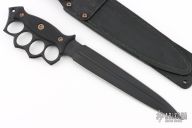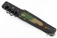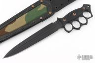 Embodying history and our own design philosophies, Lady Death is our rendition of the classic trench knife.  We decided to go big, like no other, with a 15" overall length, and 9 5/8" CPM-Magnacut double-edge dagger blade with a long fuller down the middle.  The knuckle duster style handle acts as a guard to protect your hands, and the aggressive outward shape works well for raking.  To round out the overall shape, the end of the handle features a pronounced pomel for hammer-striking.  The handle is finished with Dirty Olive G10 handle slabs with a checkered texture that is suitable in dry or wet conditions.  The handle slabs are attached with Grade 5 Titanium fasteners that are electro-anodized in bronze to round out the look.  Lady Death includes a brown leather sheath with a contrasting green canvas inlay.  The sheath is ambidextrous, and can be worn on a belt or attached to PALS webbing.