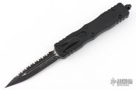 This Dirac Delta OTF automatic by Microtech features a D/E DLC finished blade with a fully serrated edge. The handle is DLC aluminum with a stainless steel tip down clip. Serial number 11356 and dated 10/2023. Comes with original box and papers. Excellent Condition.